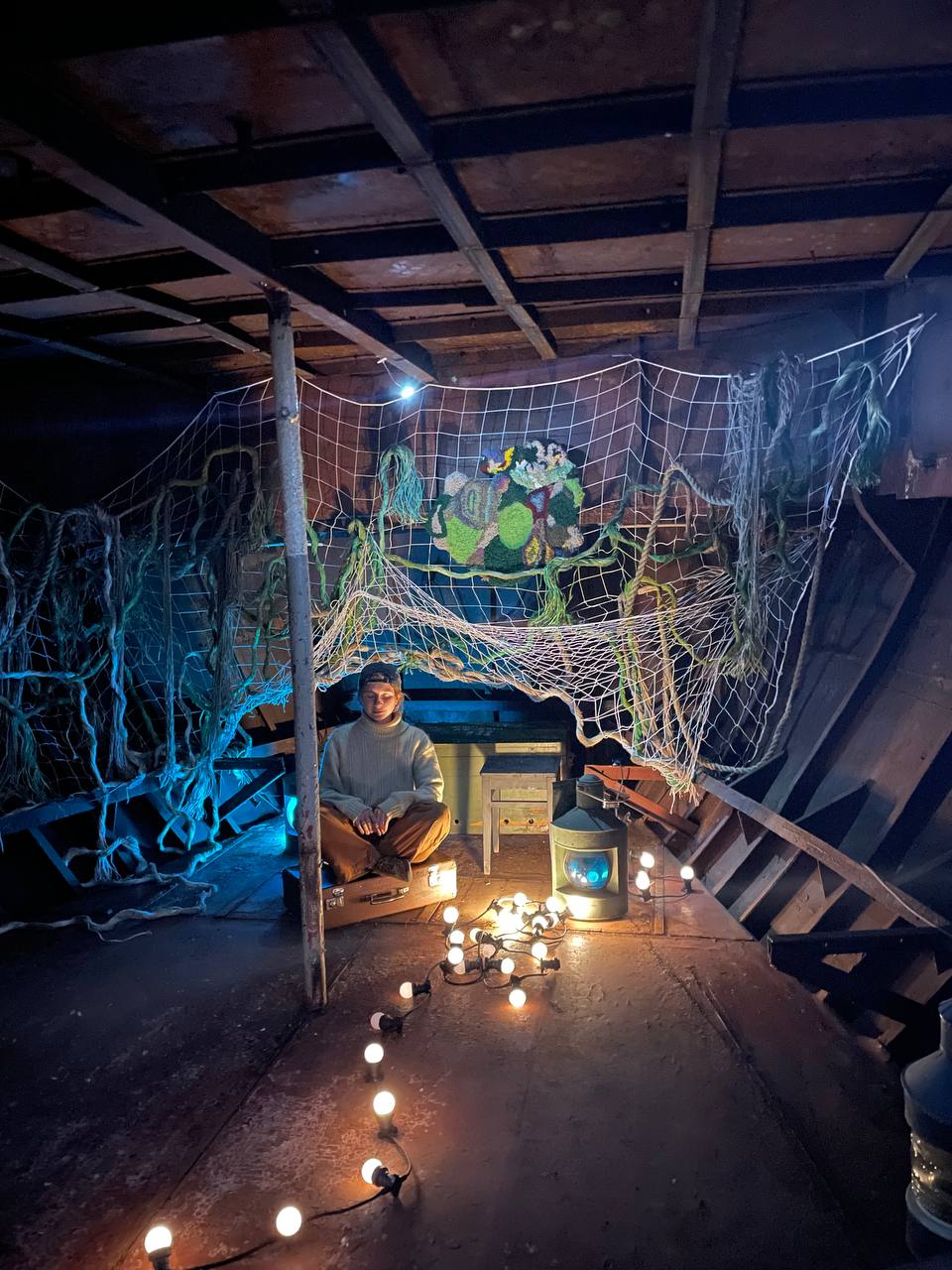 «Летом 2024 года я поехала в Архангельск на лабораторию „Выход в город“, которую проводил Московский музей современного искусства. Нам дали старый пассажирский корабль „Коммунар“ и предложили сделать что-то с этим кораблем, дать ему вторую жизнь в качестве выставочного объекта. Здесь я познакомилась с художницей Наташей Суворовой. Нам предложили „поколдовать“ над носовой частью корабля изнутри. Тогда Наташа придумала инсталляцию с мхом», — рассказала художница.