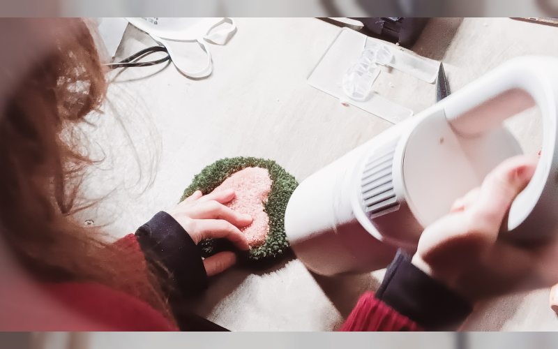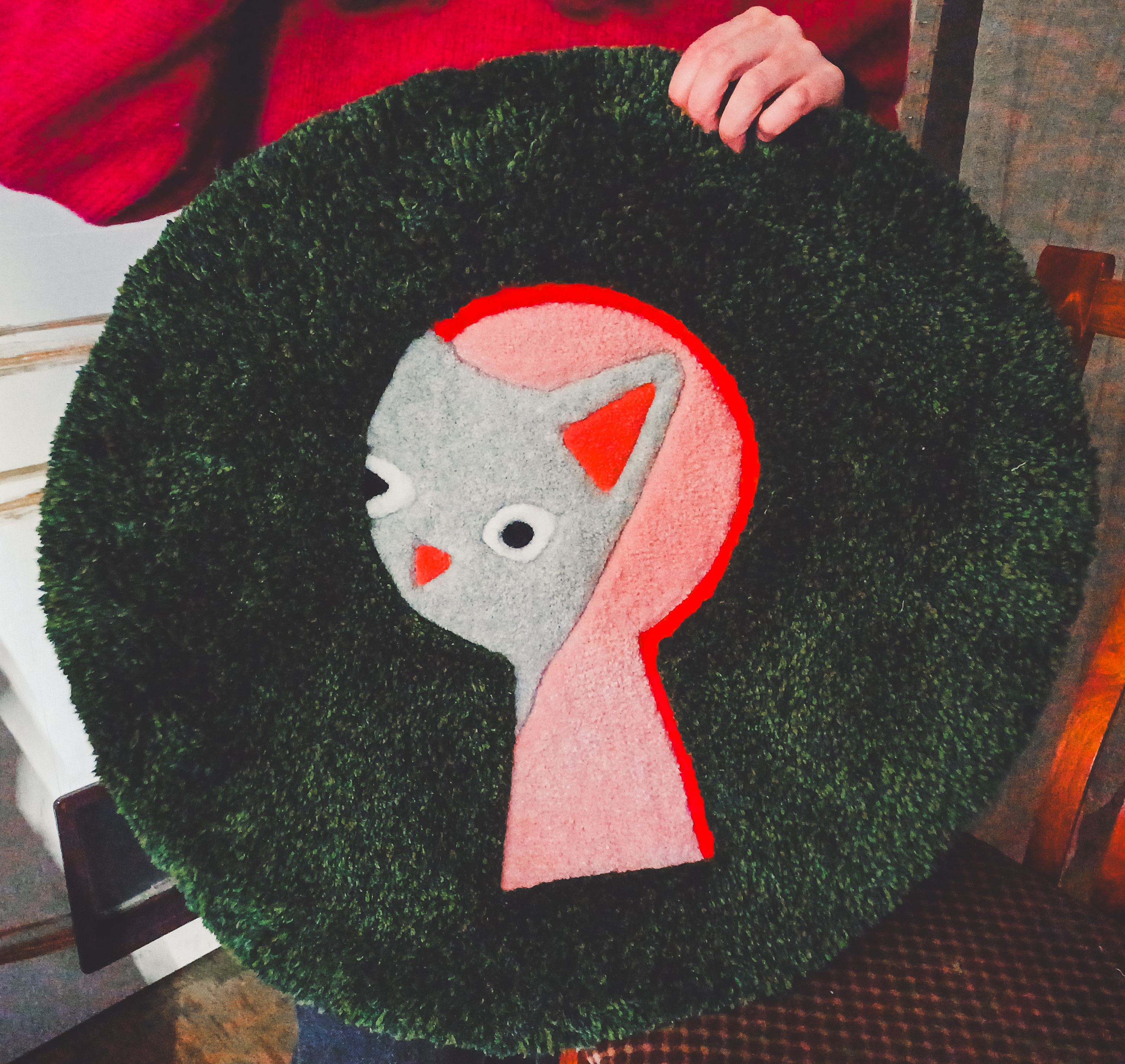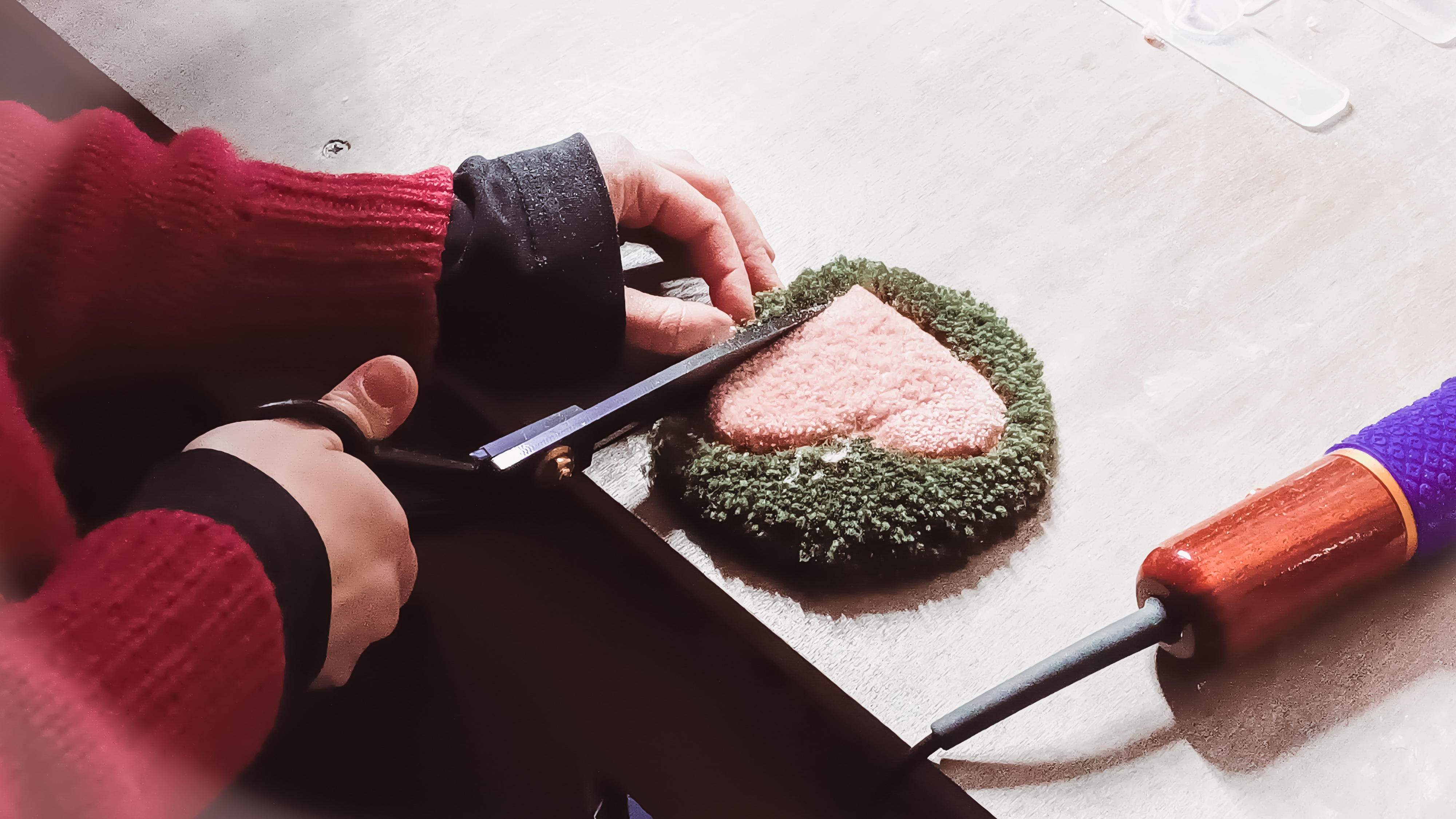 Затем с помощью тафтингового пистолета она забивает на ткани нужный рисунок, комбинируя нитки и делая изображение объемным. Пистолет пробивает полотно, вдевает в него нитку и там ее разрезает.