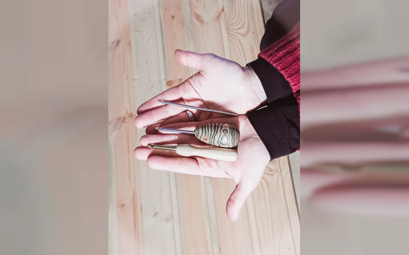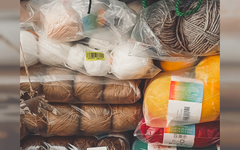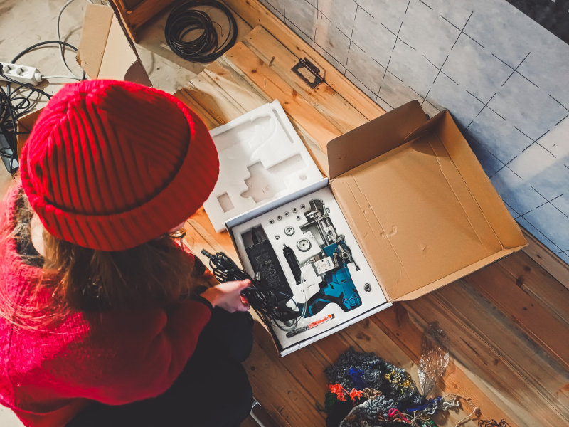 Мастерица берет нитки определенной толщины и вдевает их в тафтинговый пистолет.