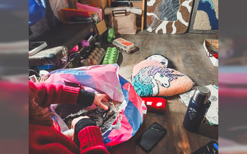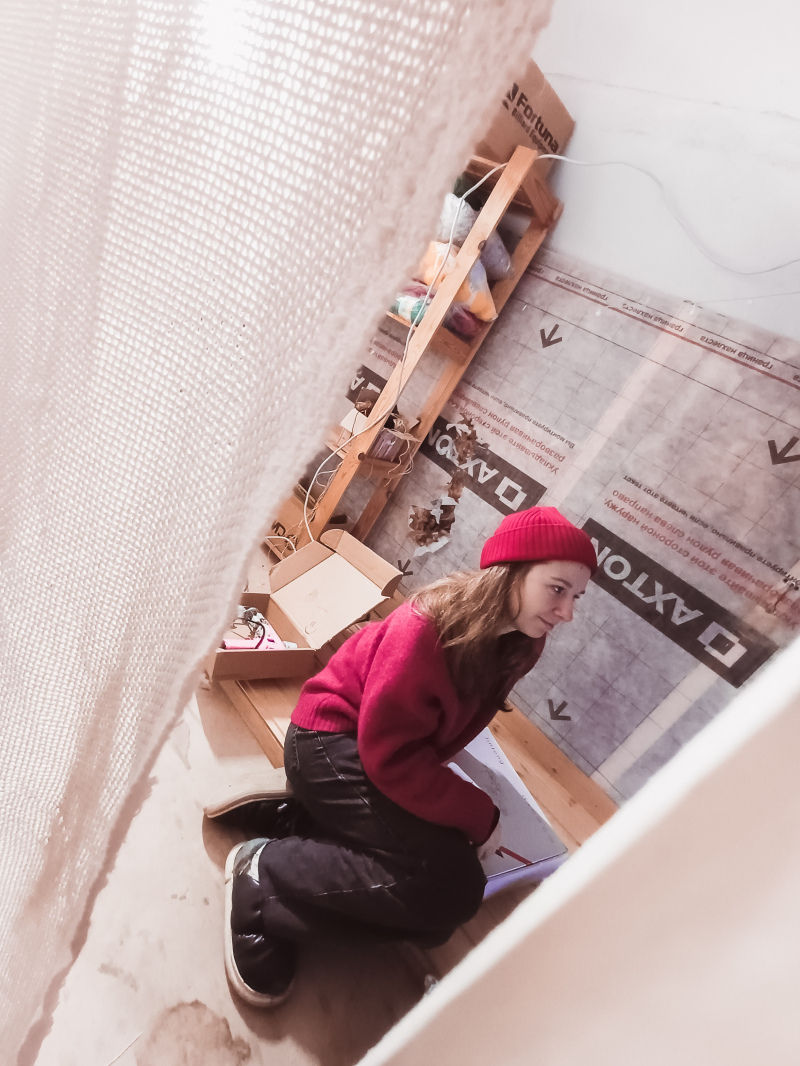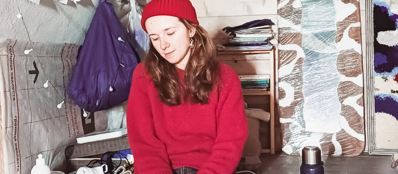 Наташа Новицкая родилась и жила в Мурманске, а весной 2023 года переехала в Карелию. Девушка занималась разными видами творчества: вела уроки акварельного скетчинга, реставрировала мебель, много вязала. Несколько лет назад Наташа увлекалась контактной импровизацией и созданием инсталляций. Интерес к современному искусству привел ее к созданию тафтинговых ковров