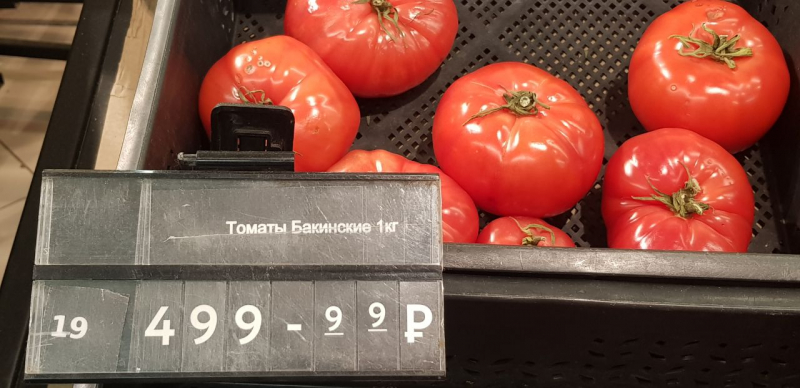 Так, килограмм бакинских томатов в магазине стоит 500 руб., короткоплодных огурцов — 410 руб., при этом один длинный огурец стоит 140 руб. Картофель для жарки и мытая морковь оценены по 80 руб. за килограмм. Полкило местной сметаны стоит 130 руб., столько же неместного творога — 290 руб.