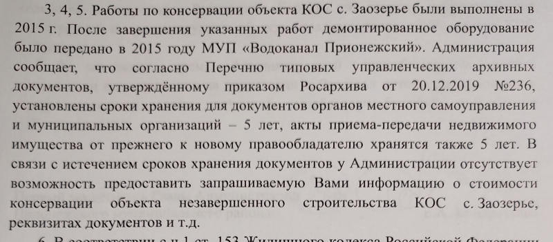 «Администрацией Прионежского муниципального района обеспечено проведение консервации объекта исходя из имеющегося объема бюджетного финансирования. Часть демонтированного с КОС Заозерья оборудования в период до 2018 г. фактически передана в адрес МУП «Водоканал Прионежский», хранится в помещении органа местного самоуправления. Вместе с тем, данное оборудование входит в единый комплекс КОС Заозерья, включено в реестр муниципального имущества Прионежского муниципального района в качестве объекта незавершенного строительства».