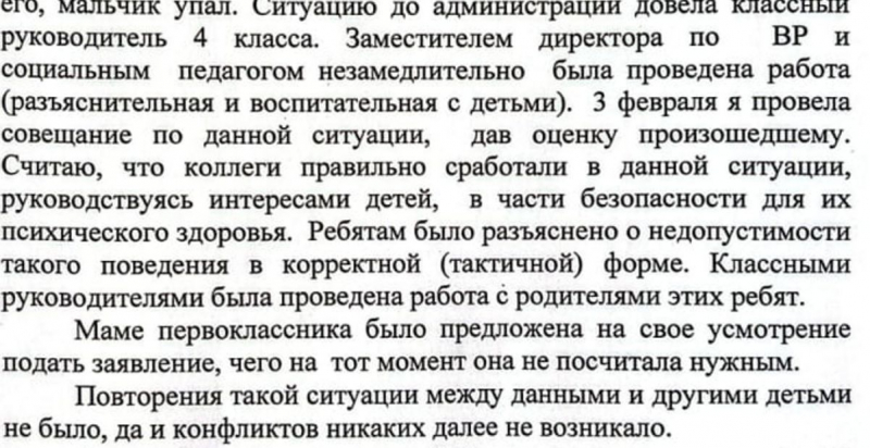 Как нам удалось выяснить, случай действительно имел место, и были свидетели. Инцидент зафиксировали педагоги, организовали проверку, сообщили родителям обоих учеников, провели беседу с участниками конфликта. Из пояснительной записки директора школы: