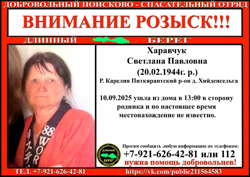 Как сообщают в группе ВКонтакте "Питкяранта. ДПСО "Длинный Берег", 10 сентября в районе деревни Хийденсельга Питкярантского района пропала Светлана Харавчук. 81-летняя женщина ушла из дома в сторону родника в районе 13:00, и с тех пор её местонахождение неизвестно. Спасатели призывают всех неравнодушных присоединиться к поиску пенсионерки.