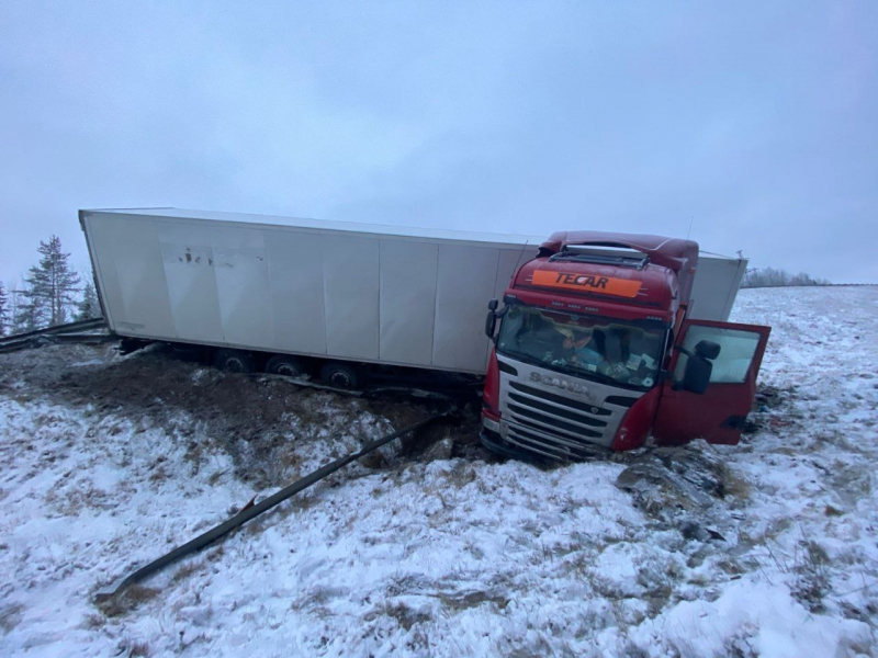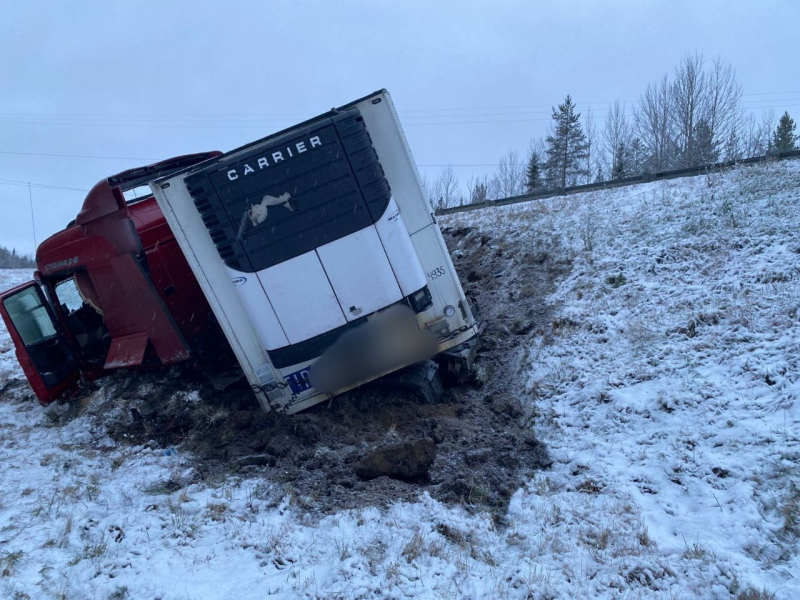 Как сообщил в Госкомитете по безопасности, сегодня днем, 16 ноября в 14.30, на 853 км федеральной автодороги Р-21 «Кола» в Кемском районе груженая фура съехала в кювет, под откос.