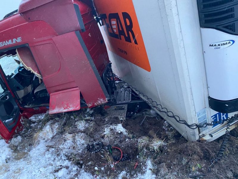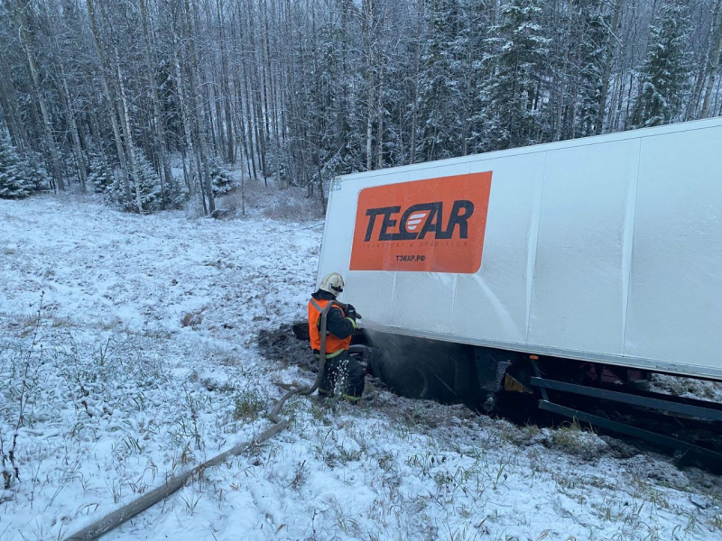 Водитель не удержал фуру с грузом на дороге в Карелии и упал в кювет. Из кабины выбрался сам.