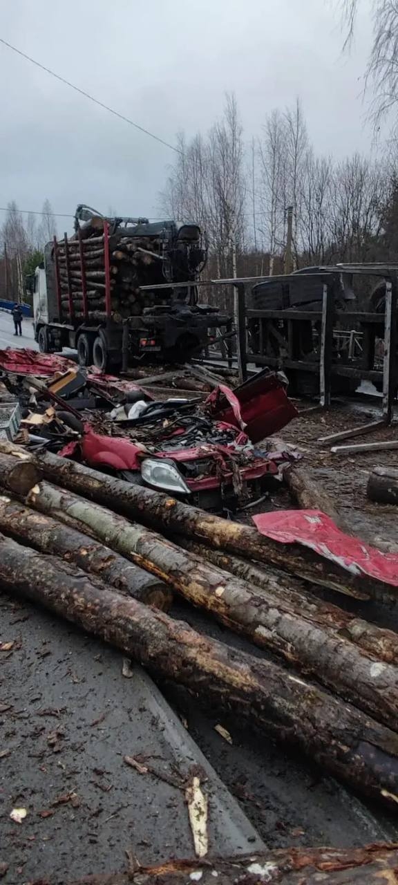 Как сообщили в Госавтоинспекции Карелии, 18 декабря около 10:00 на дороге А-215 «Подъезд к городу Петрозаводску» в Шокше 45-летний водитель лесовоза не справился с управлением. Прицеп с грузом вынесло на полосу встречного движения и он опрокинулся на легковой автомобиль Lada Largus.