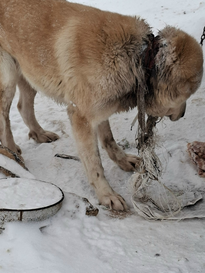 Ранее неравнодушные жители Карелии спасли алабая, которому в шею впилась цепь.