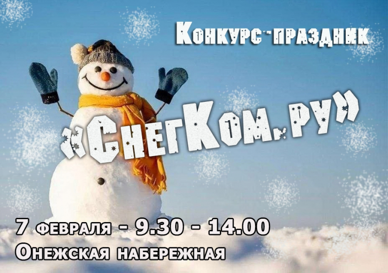 В 9:30 на набережной у пушек пройдет семейный конкурс «СнегКом.ру». Городской дом культуры и Петровский Дворец предлагают жителям слепить снеговиков. Снеговик должен иметь классическую форму — три снежных кома, поставленные один на другой (кроме номинации «Выйти за рамки»).