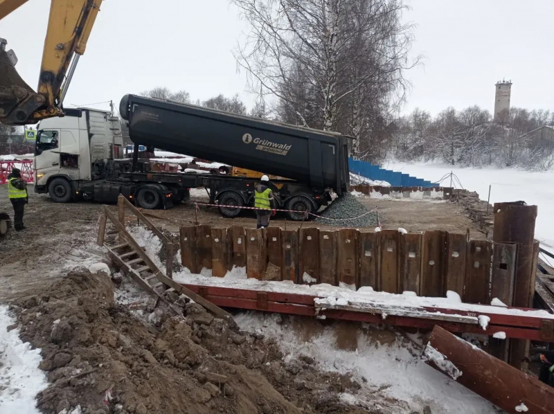 Дорожники строят временную переправу в Олонце, чтобы обеспечить проезд транспорта, когда демонтируют аварийный мост через реку Мегрега.