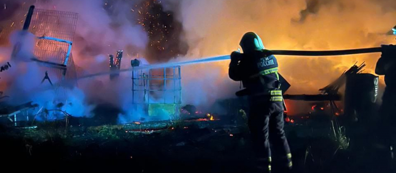 На месте пожара обнаружили 6 бочек с неустановленной жидкостью и 2 газовых баллона. Их унесли в безопасное место.