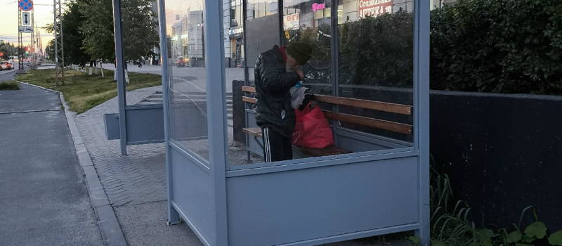 Бомж устроил дом на остановке в Петрозаводске и никого туда не пускает