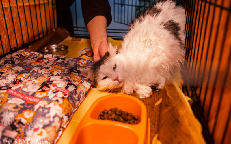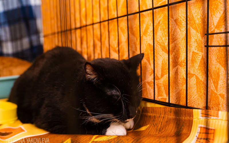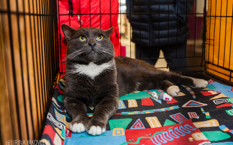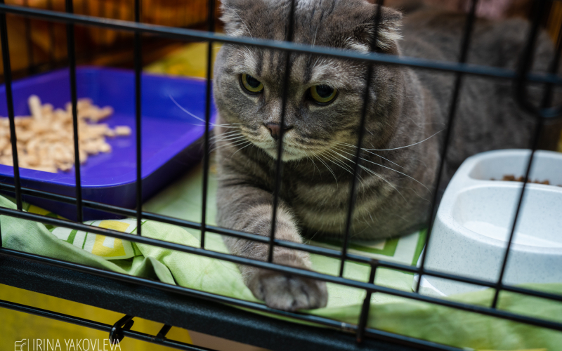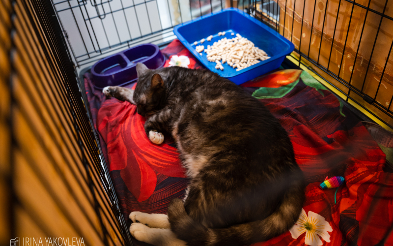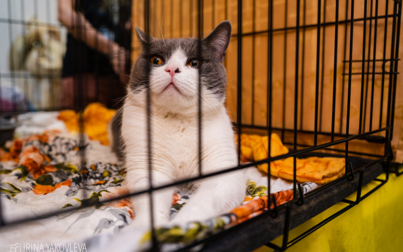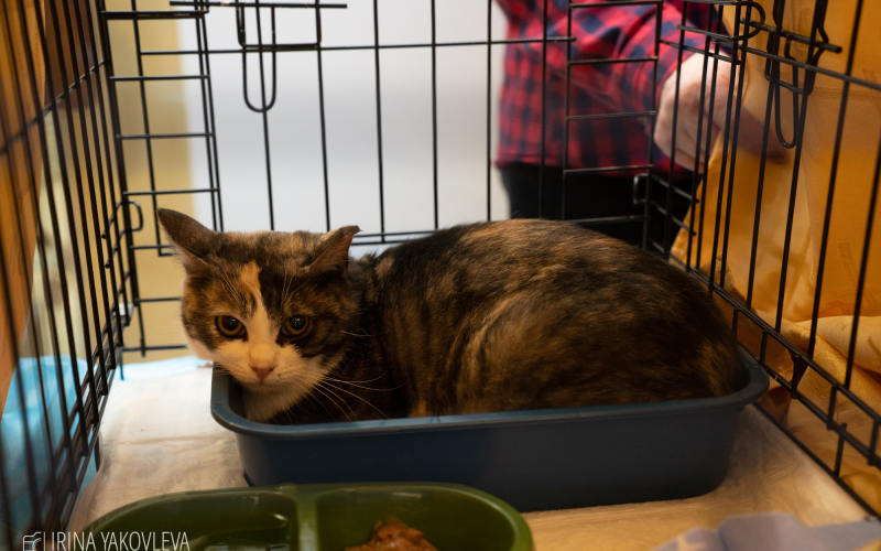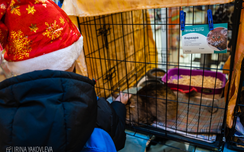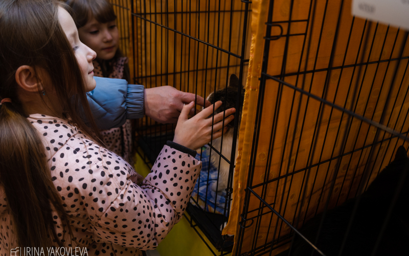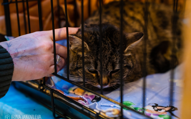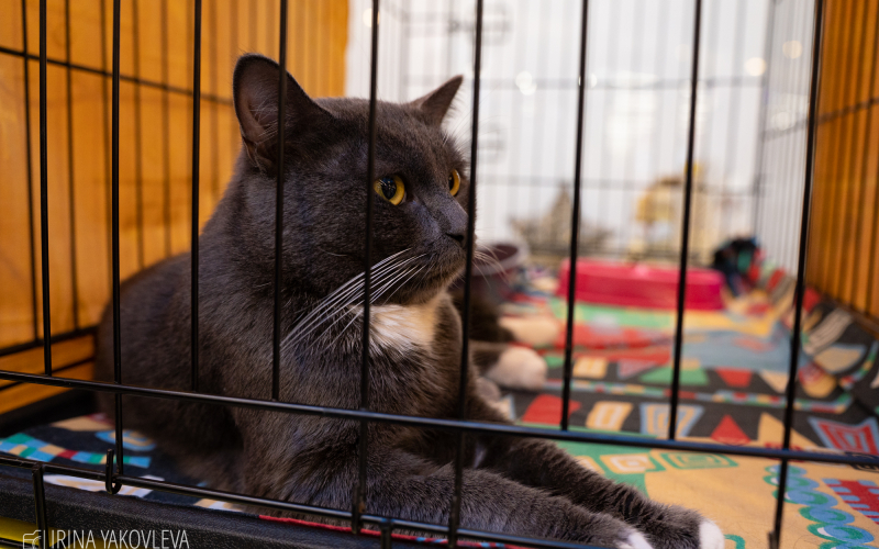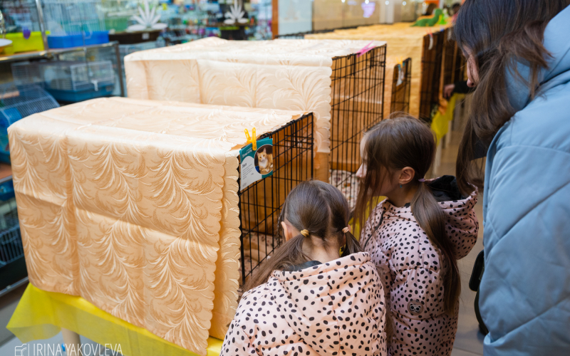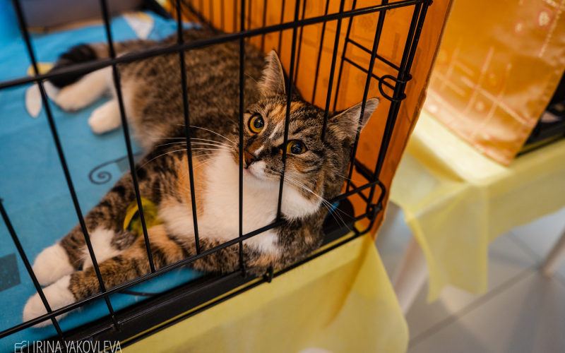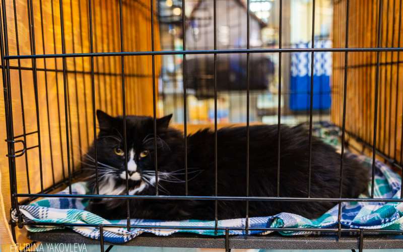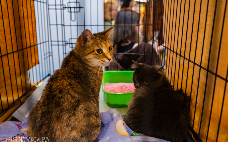 Проводит мероприятие Первый петрозаводский общественный приют. В клетках сидят 34 кошки, и каждая ждет, что ее кто-нибудь заберет к себе и у нее появится свой дом.