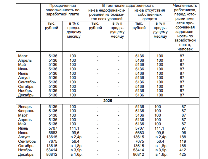 Для сравнения, в течение всего 2024 года число работников, ожидающих зарплату, не менялось и было равно 87. Этот показатель сохранялся и до мая прошлого года. Затем обозначился рост с некоторыми колебаниями и резкий скачок к концу года — сперва до 412, а затем до 425 человек.
