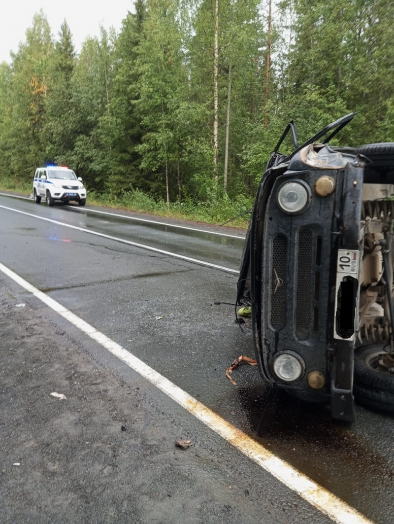 Внедорожник УАЗ перевернулся на трассе в Суоярвском округе, есть пострадавшие.