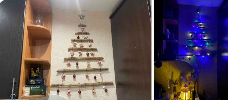 Заметили, что трендом стали елки без иголок. Их создают из досочек, книг, веток, одежды, посуды… Все, что можно найти в быту и выложить в форме треугольника. После световая гирлянда становится заключительных моментом, превращающим конструкцию в новгоднюю красавицу.