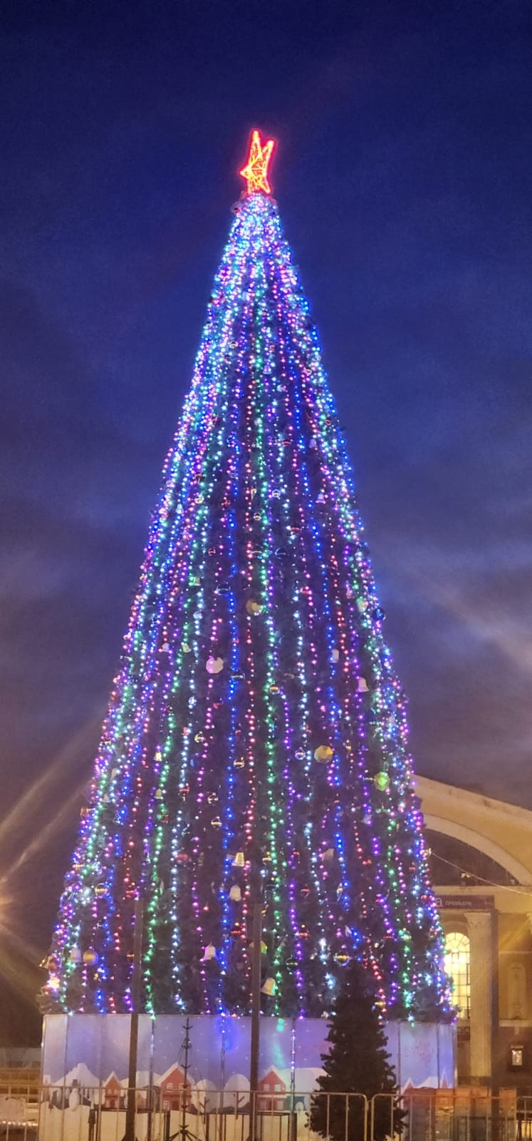 В Петрозаводске на площади Кирова установили новогоднюю ель, праздничную гирлянду тоже сразу зажгли.