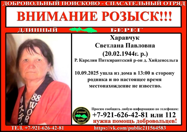 Поисковый отряд «Длинный берег» информирует, что 10 сентября в 13:00 ушла из дома 81-летняя жительница деревни Хийденсельга. Она ушла в сторону родника и не вернулась.