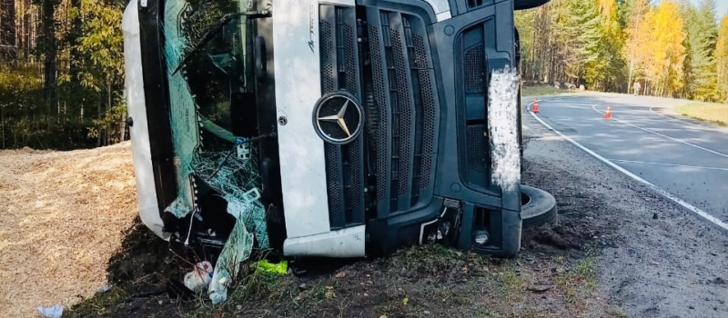 Как сообщили в четвертом отряде ФПС Карелии, 29 сентября в 12:32 на 25 километре трассы «Сегежа – Надвоицы» в Сегежском округе грузовик Mercedes-Benz съехал с дороги и упал на бок.