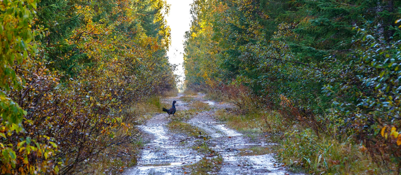 Фотограф Илья Тимин на своей странице ВКонтакте опубликовал снимок, на котором глухарь гуляет по лесной дорожке среди золотистой листвы.