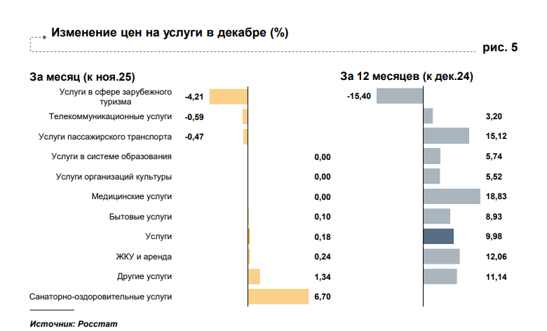 Сильнее всего в 2025 году в республике выросли цены на услуги (+9,98%). В том числе подорожали проезд в пассажирском транспорте и размещение в гостиницах. Стоимость поездок за границу снизилась, указано в материалах Банка России.