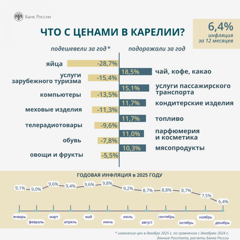 «Годовая инфляция в Республике Карелия замедлилась, но осталась выше, чем в целом по России. За 12 месяцев в республике продовольственные и непродовольственные товары, а также услуги подорожали сильнее, чем в целом по стране», — говорится в материалах Банка России.