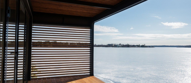 Каждый дом оборудован двумя спальнями, гостиной, санузлом и кухней. Панорамные окна и террасы открывают вид на озеро и лес.