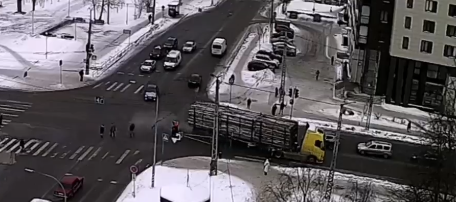 В Петрозаводске на пересечении проспекта Александра Невского и улицы Калинина у лесовоза лопнуло колесо. Момент дорожного происшествия зафиксировала камера уличного наблюдения. Ролик опубликован в сообществе "Подслушано у водителей Птз и Карелии".
