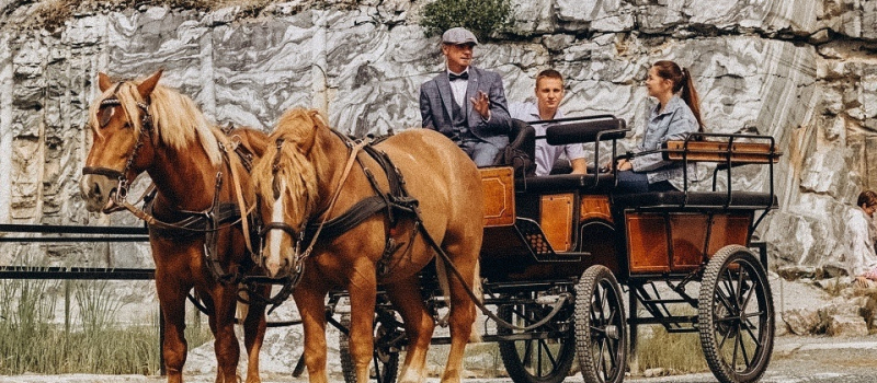 Конный экипаж промчит туристов по Горному парку в Карелии