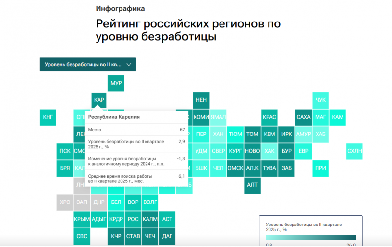 Так, Карелия заняла 67 место. Уровень безработицы во втором квартале составил 2,9%. В сравнении с прошлым годом безработных стало меньше – уровень снизился на 1,3 процентных пункта. Среднее время поиска работы составило 6,1 месяцев.