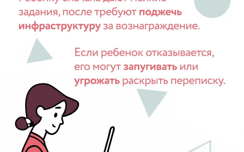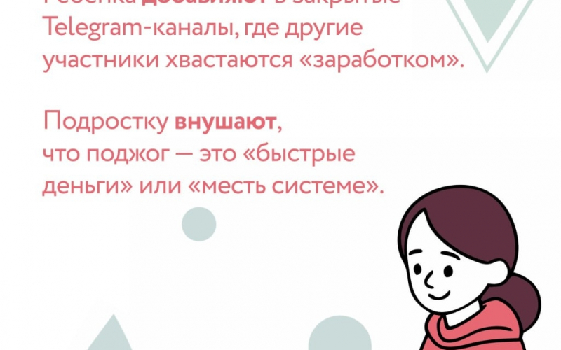 Министерство образования республики рассказало, как злоумышленники вербуют подростков для поджогов. Подростку внушают, что поджог — это «месть системе». Вербовщики представляются «единомышленниками» или «работодателями», давят на детей, обещая «легкие деньги» за «безобидные задания». Если ребенок отказывается, его могут запугивать, угрожая открыть переписку.
