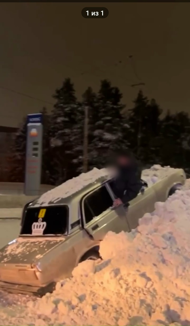 Компания юнцов на «семерке» устроила дрифт на кольце на Древлянке и вылетела в сугроб. Друзья на втором авто, снимавшие ДТП, под музыку, маты и радостные крики сняли «жигули» со снежного Олимпа.