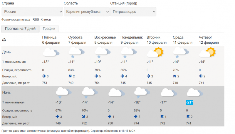 По прогнозу гидромета РФ до 12 февраля, дневные температуры в Петрозаводске достигнут -14℃. А ночью подморозит до -21℃.