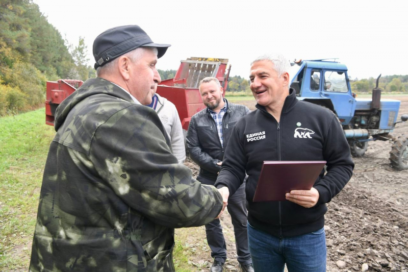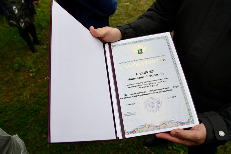 Глава Карелии Артур Парфенчико прямо в поле вручил олонецкому фермеру Анатолию Назарову благодарность федерального министра сельского хозяйства за многолетний добросовестный труд.