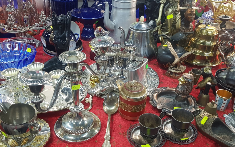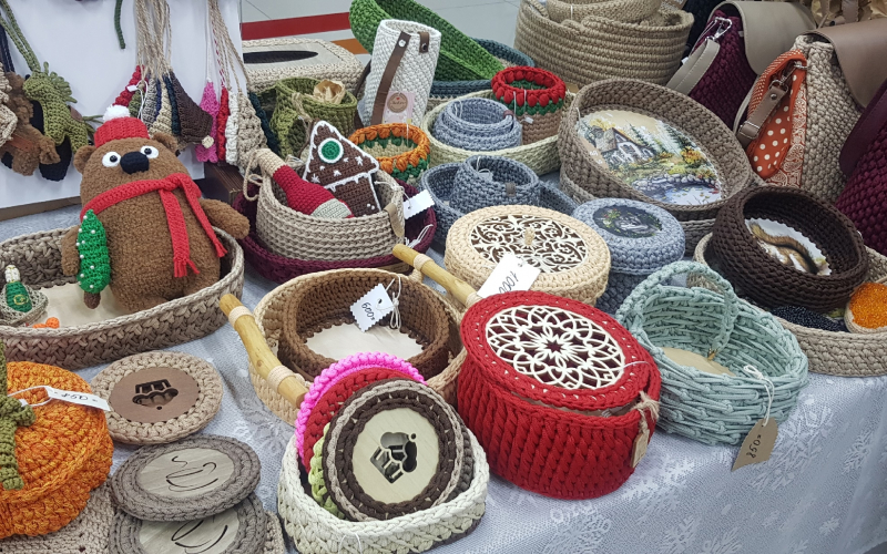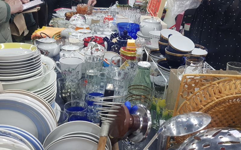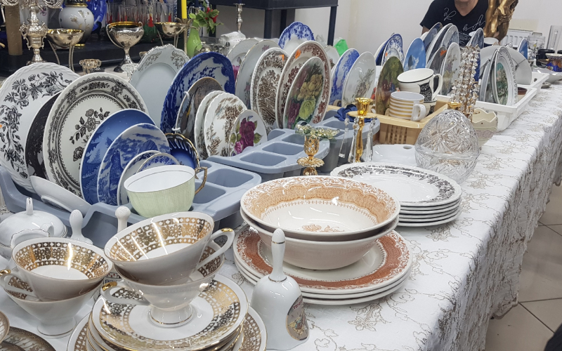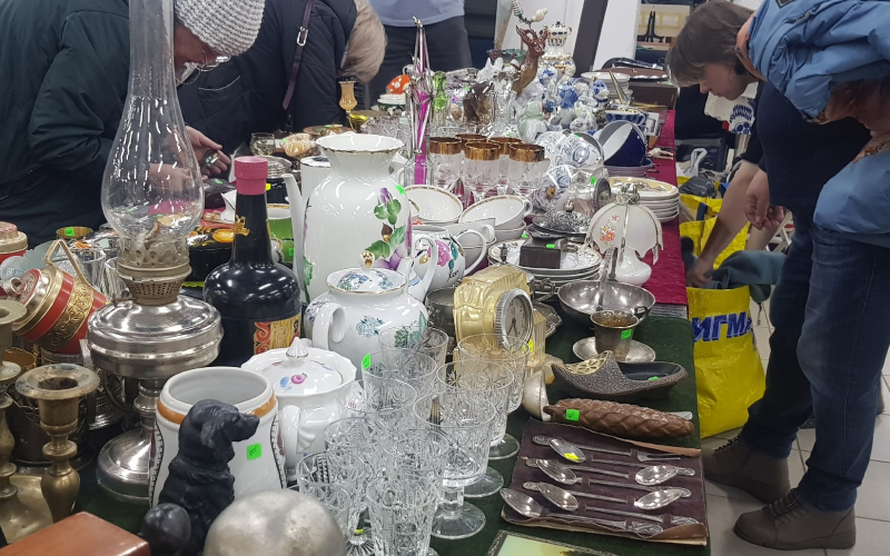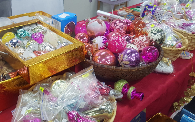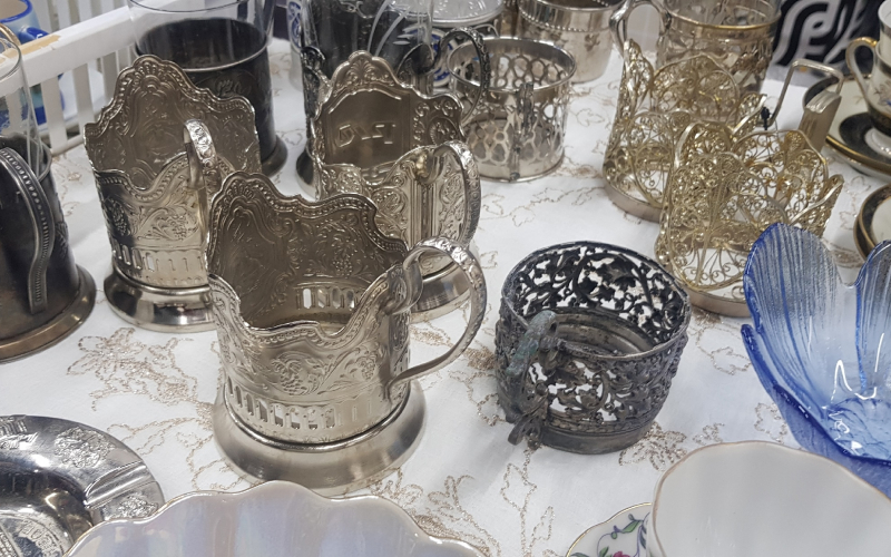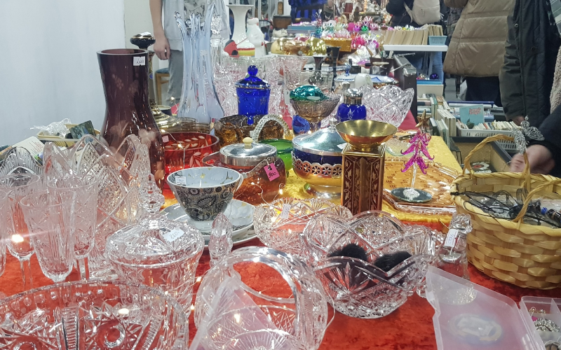 В продаже посуда и бижутерия, лакомства, украшения, декор для дома, одежда, елочные игрушки, хрусталь и подсвечники, пластинки, вышитые полотенца, корзины, аромасвечи.