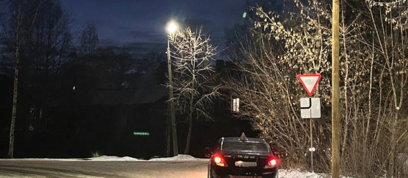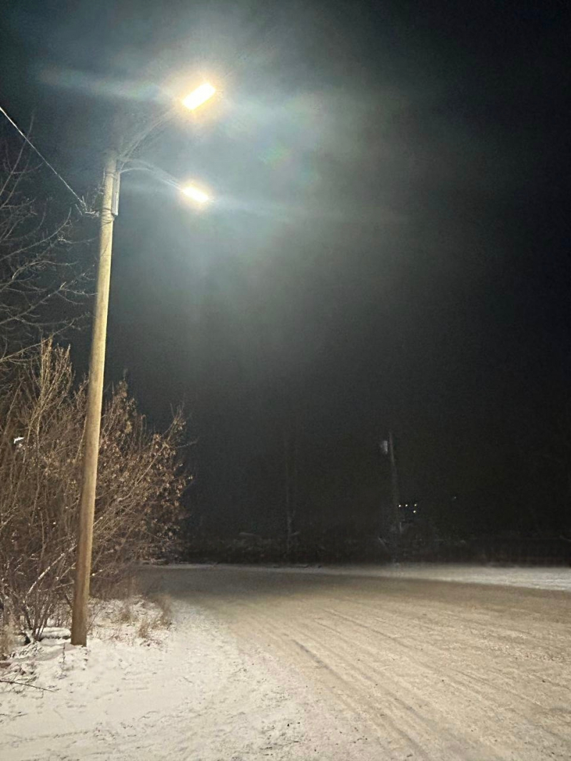 Новые фонари на деревянных столбах зажгли на перекрестке в Петрозаводске