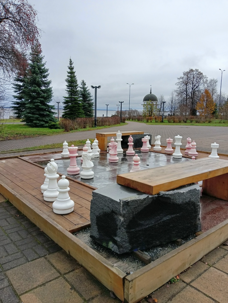 На набережной Петрозаводска, рядом с Ротондой, можно сыграть в бело-розовые уличные шахматы.