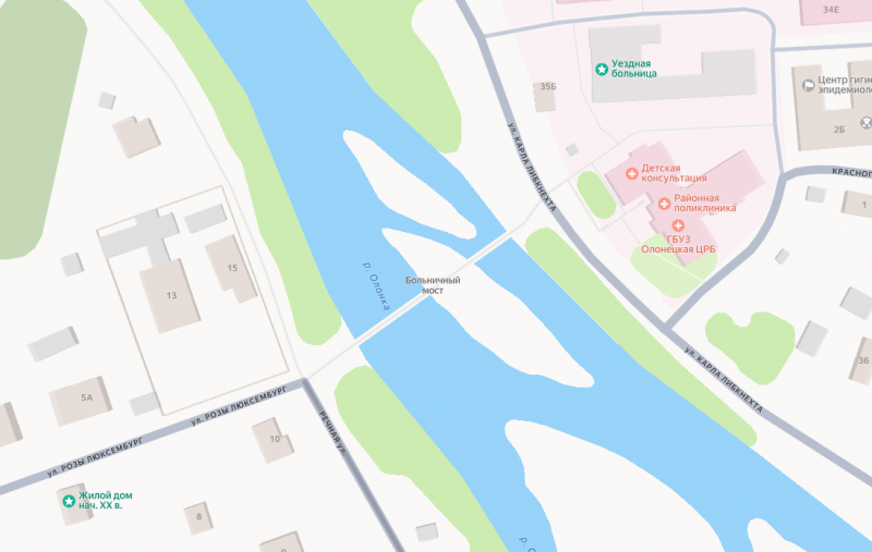 Деревянный Больничный мост в Олонце соединяет два берега реки Олонки. По нему, в частности, можно добраться до местной больницы.