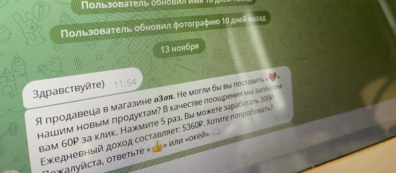 Как сообщили в МВД Карелии, с пенсионеркой из Питкярантского округа связались от имени популярного маркетплейса и предложили получать доход за простые действия — проставлять «лайки» в карточках товаров. Также её добавили в чат, где кураторы всем желающим раздавали задания для позитивных отзывов. Вскоре лимит товаров был исчерпан. Менеджер написал, что для получения дохода теперь нужно не только «лайкать» товары, но и выкупать их.