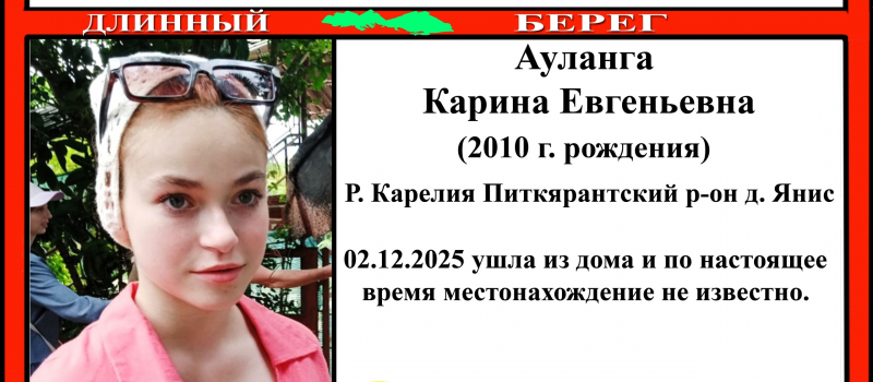 Карина Ауланга 2010 года рождения ушла из дома в деревне Янис Питкярантского округа и пропала. Ее местонахождение неизвестно со вторника, второго декабря. Об этом информирует поисковый отряд "Длинный берег".