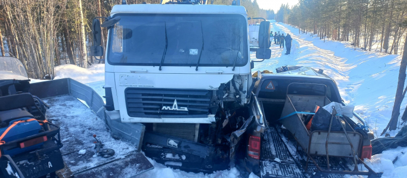 По информации Госавтоинспекции Карелии, вблизи поселка Кузема водитель грузовика МАЗ допустил столкновение со встречным автомобилем Volkswagen Amarok с прицепом. В результате происшествия получили пострадали водитель и пассажир пикапа.