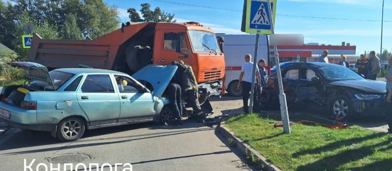 Напомним, 8 сентября в 13:17 поступило сообщение о столкновении грузового и двух легковых автомобилей в Кондопоге на пересечении улиц Заводская и Комсомольская.