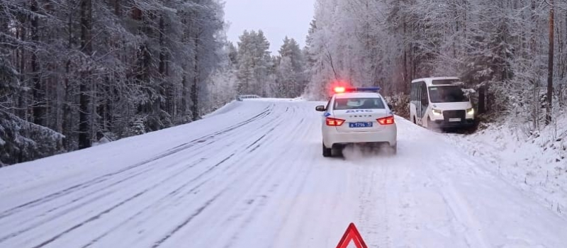 Как сообщили в Госавтоинспекции Карелии, в 7:55 18 ноября на подъезде к поселку Чупа рейсовый автобус съехал в кювет.