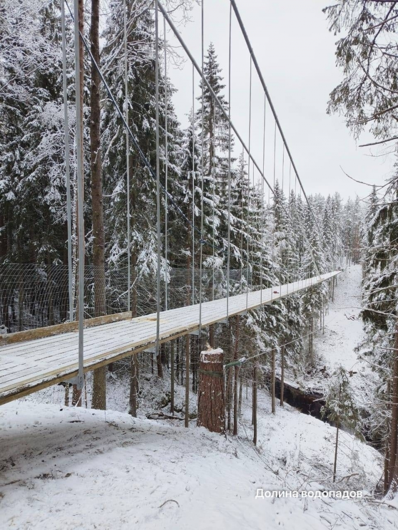 В Лахденпохском районе завершается строительство самого длинного подвесного пешеходного моста в Карелии.