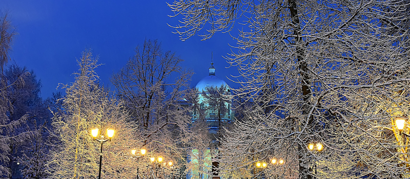 «Зимний Петрозаводск, 29-декабря 2025 г. Александро-Невский кафедральный собор во время вечерних сумерек после снегопада», — подписал снимки фотограф.