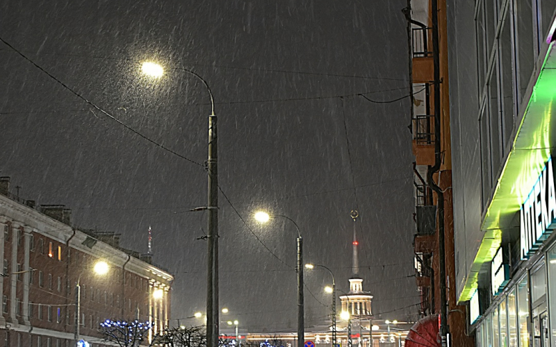 "Вечерний Петрозаводск 27-декабря 2025г. Фотозарисовки на пл. Гагарина во время снегопада", - написал в комментарии к фото Вартан Цатурян.