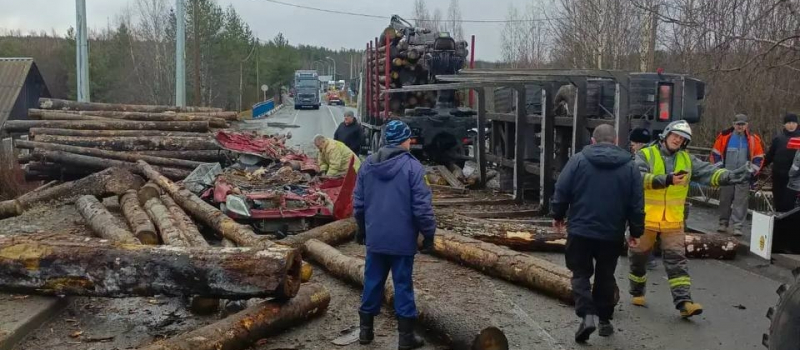 Спасатели показали фото, как водителя в Карелии насмерть придавило бревнами в ДТП