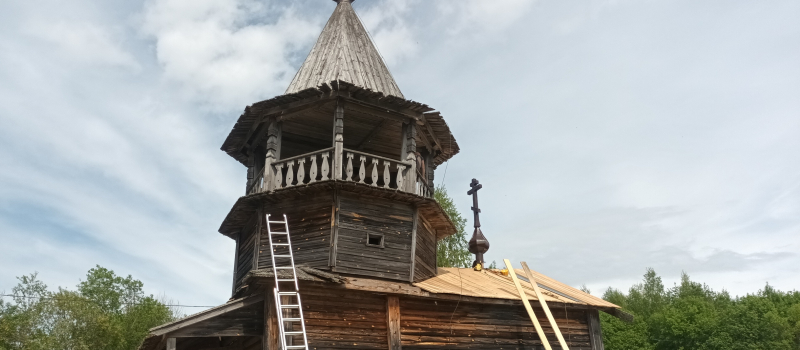 Работы по консервации выполняются волонтерами проекта "Общее Дело. Возрождение деревянных храмов Севера" под наблюдением эксперта всероссийского центра деревянного зодчества Татьяны Незвицкой.