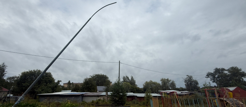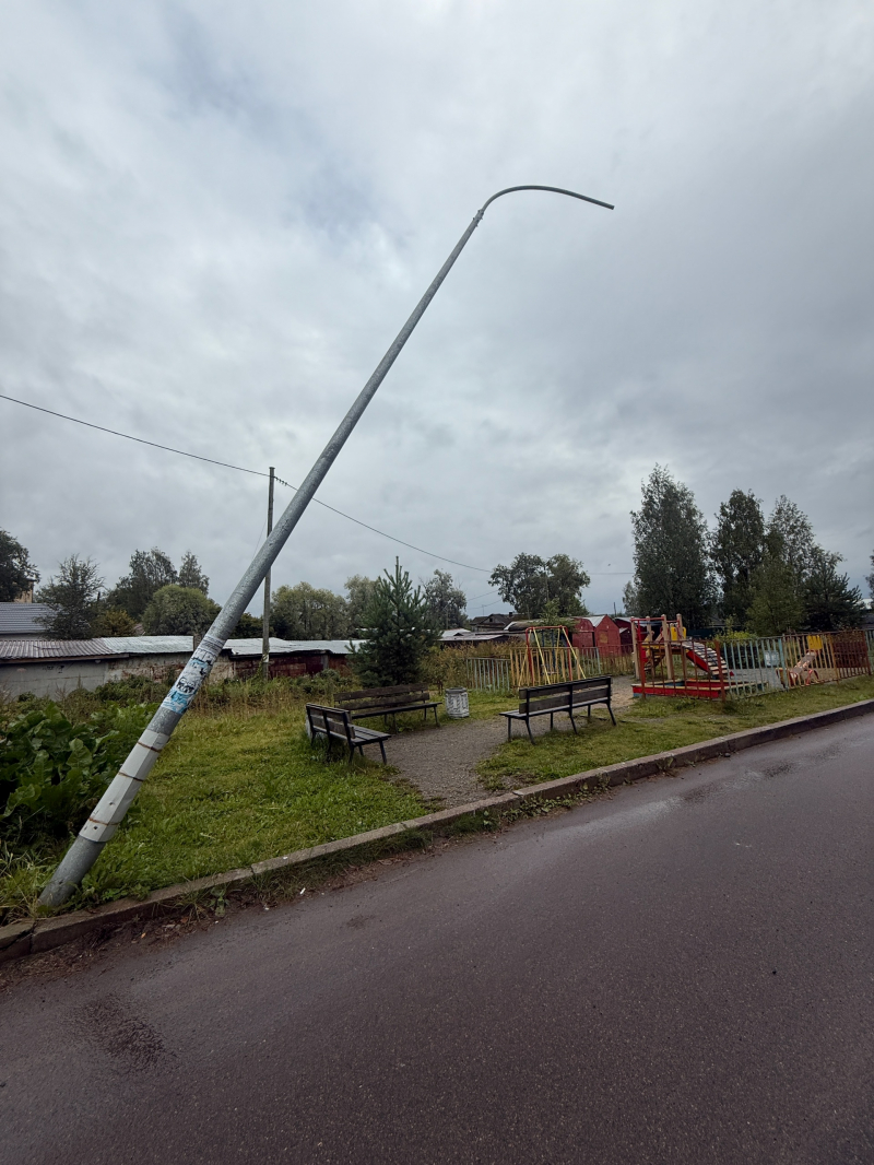 Столб опасно накренился над детской площадкой в Сортавале недалеко от Валаамской пристани.