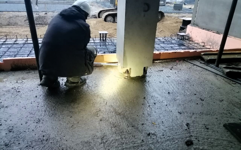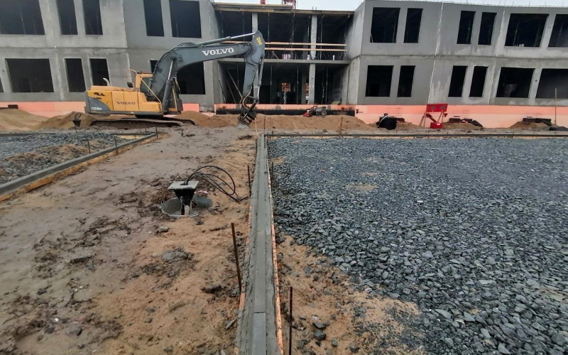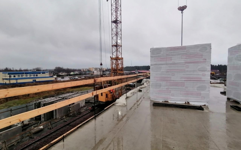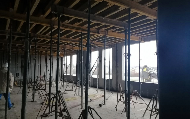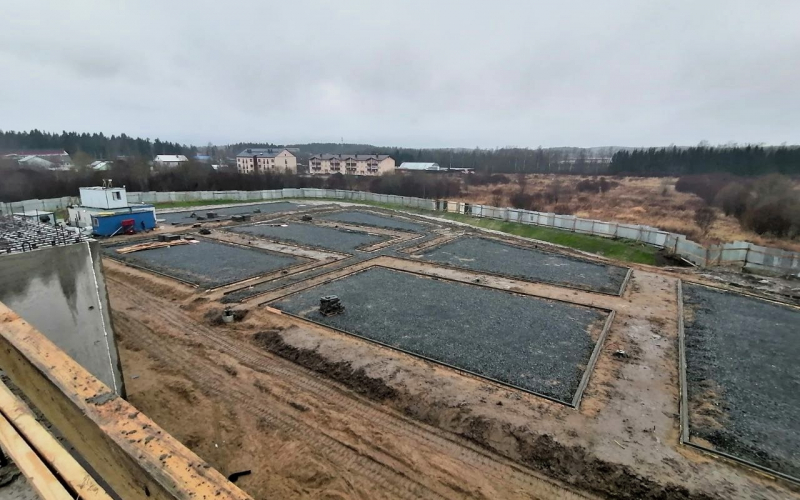 Выполняются работы по устройству песчаного основания для тротуара и озеленения территории. В цокольном этаже здания сооружается кирпичная кладка перегородок из силикатного кирпича для помещений теплового пункта, водомерного узла, насосной, хозяйственной кладовой. Над вторым этажом здания продолжаются работы по армированию перекрытия.